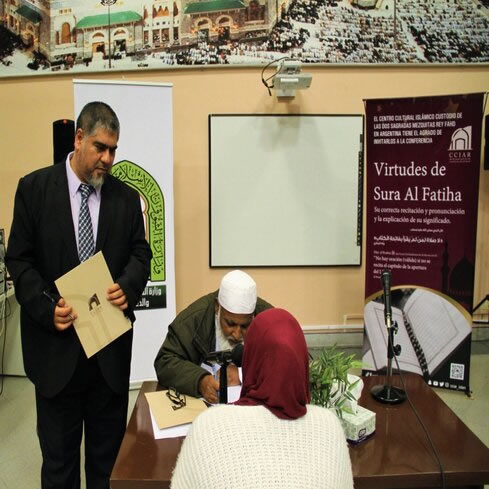 19/06/2019 El día Miércoles 19 de Junio de 2019, el Señor Director del CCIAR, Sheij Ali Al Shamrani,realizó la apertura del ciclo de conferencias " Virtudes de Sura Al Fatiha", a continuación el Imam de la Mezquita el Sheij Abdullatif al Otaibi disertó sobre las virtudes y exégesis de la mencionada Sura. Finalmente los Sheijs recitaron la Sura "La Apertura del libro" conjuntamente con los presentes con el objetivo de perfeccionar las recitaciones. Quiera Al-láh hacernos de los siervos sinceros y acepte las buenas obras. Amin.