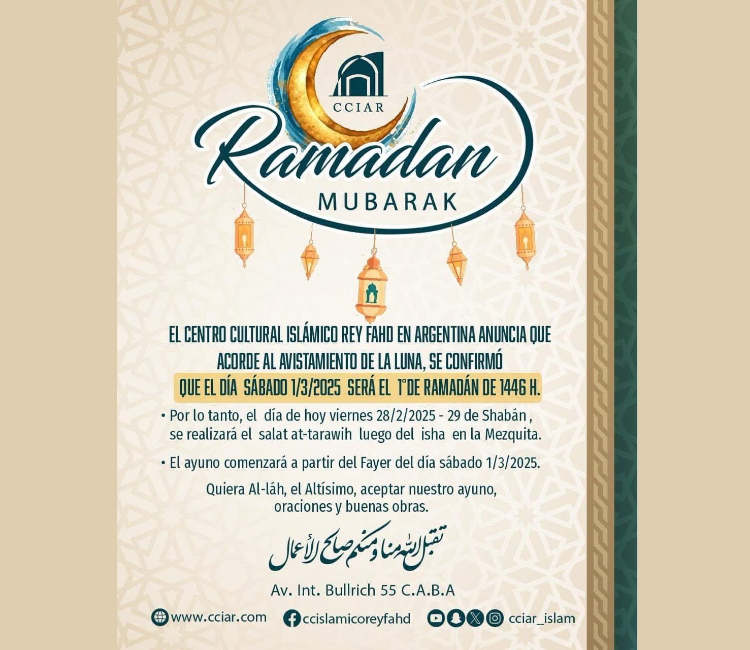 Día sábado 01/03/2025, 1° de Ramadán de 1446 H.