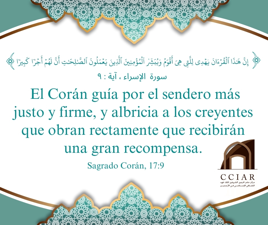 «El Corán guía por el sendero más justo y firme, y albricia a los creyentes que obran rectamente que recibirán una gran recompensa.» (Corán, 17:9)