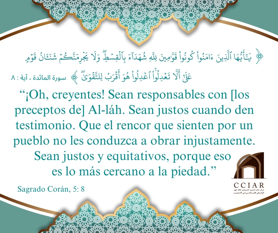 Que el rencor que sienten por un pueblo no les conduzca a obrar injustamente. Sean justos y equitativos, porque eso es lo más cercano a la piedad.»(Corán, 5:8)