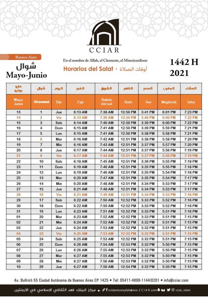 Assalamu aleikum wa rahmatullahi wa barakatuh estimados hermanos/as, adjuntamos los horarios de rezos correspondientes al mes de Shawwal 1442 h. – 2021.