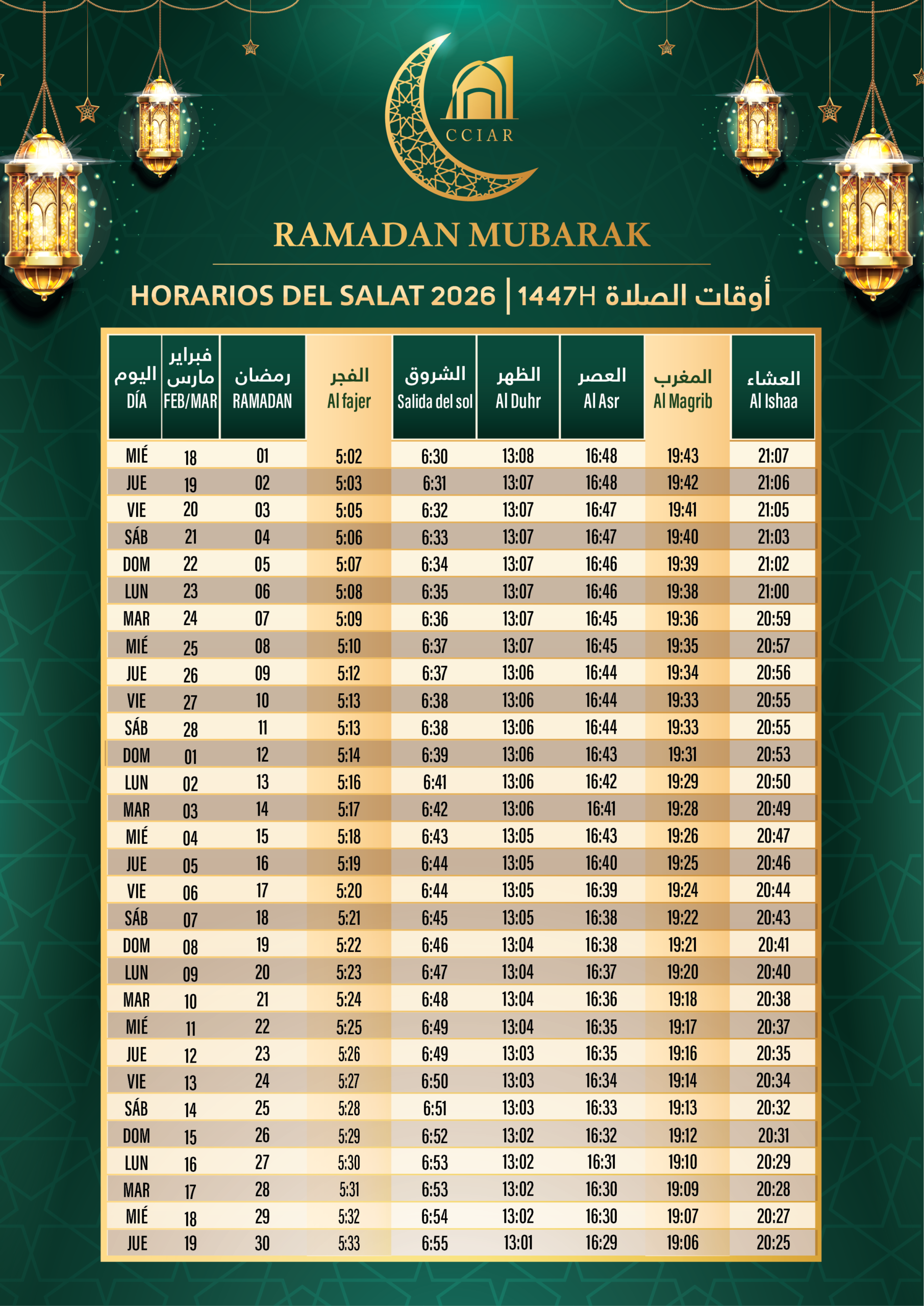 Horarios del Salat del mes de Ramadan 1447H – Febrero Marzo 2026