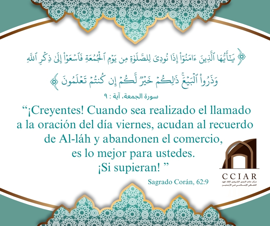 “¡Creyentes! Cuando sea realizado el llamado a la oración del día viernes, acudan al recuerdo de Al-láh y abandonen el comercio, es lo mejor para ustedes. ¡Si supieran! ” (Corán, 62:9)