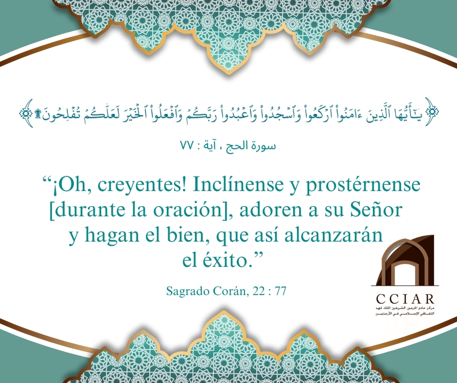 “¡Oh, creyentes! Inclínense y prostérnense [durante la oración], adoren a su Señor y hagan