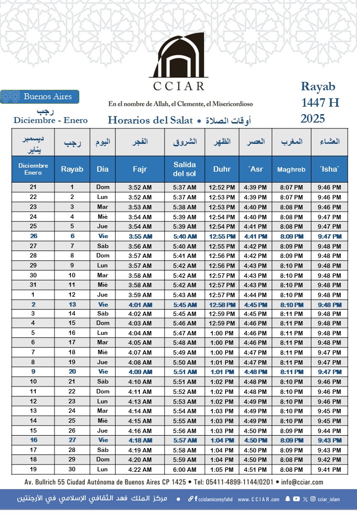Los horarios de rezos correspondientes al mes de RAYAB de 1447 H.